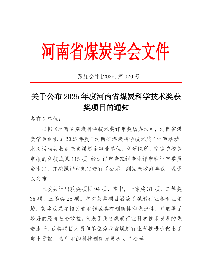 近日,河南省煤炭学会公布了2025年度“河南省煤炭科学技术奖”评审结果。由光力科技牵头及参与完成的两项科技成果光荣上榜,荣获一等奖一项,二等奖一项。